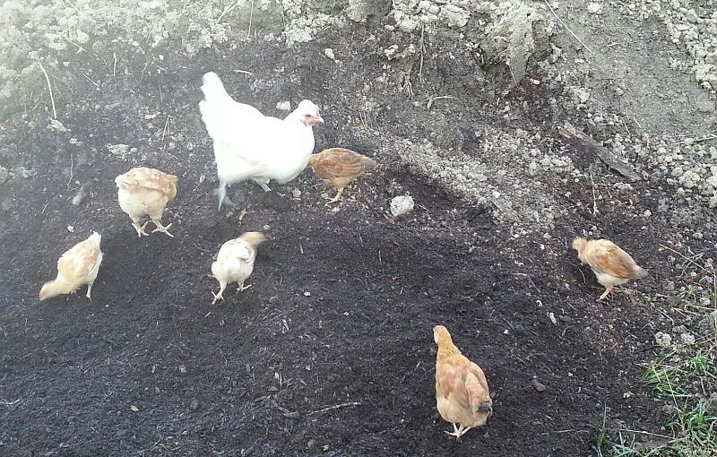 Foto : Een van onze kippen met haar geadopteerde kuikens