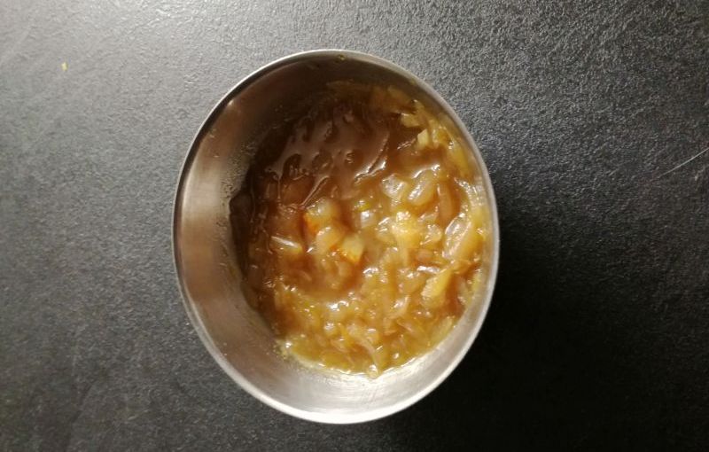 wat zeste of snippers van de schil van een kwart sinaasappel verzameld - Dit gooi je allemaal bij de ajuin, en omroeren