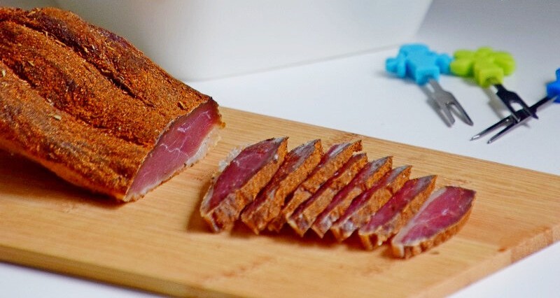 Indien je de uitrusting hebt, kan je het vlees ook nog roken tussen het ontzouten en kruiden in.