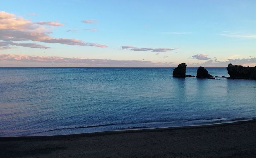 Wanneer je die trap afdaalt kom je op het lavastrand terecht. Je staat plots midden in een soort circus van rotsmuren, op een niet al te groot strand dat bestaat uit kleine zwarte zand en rotskorrels.